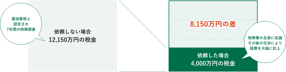 それらの交渉の結果、当初12,150万円だった税金が9,000万円、7,000万円、5,000万、4,000万円と、段階的に安くなりました。弊社報酬の160万円を差し引いても、当初の支払い税額に比べて7,990万円もお支払い額を抑えていただくことができました。